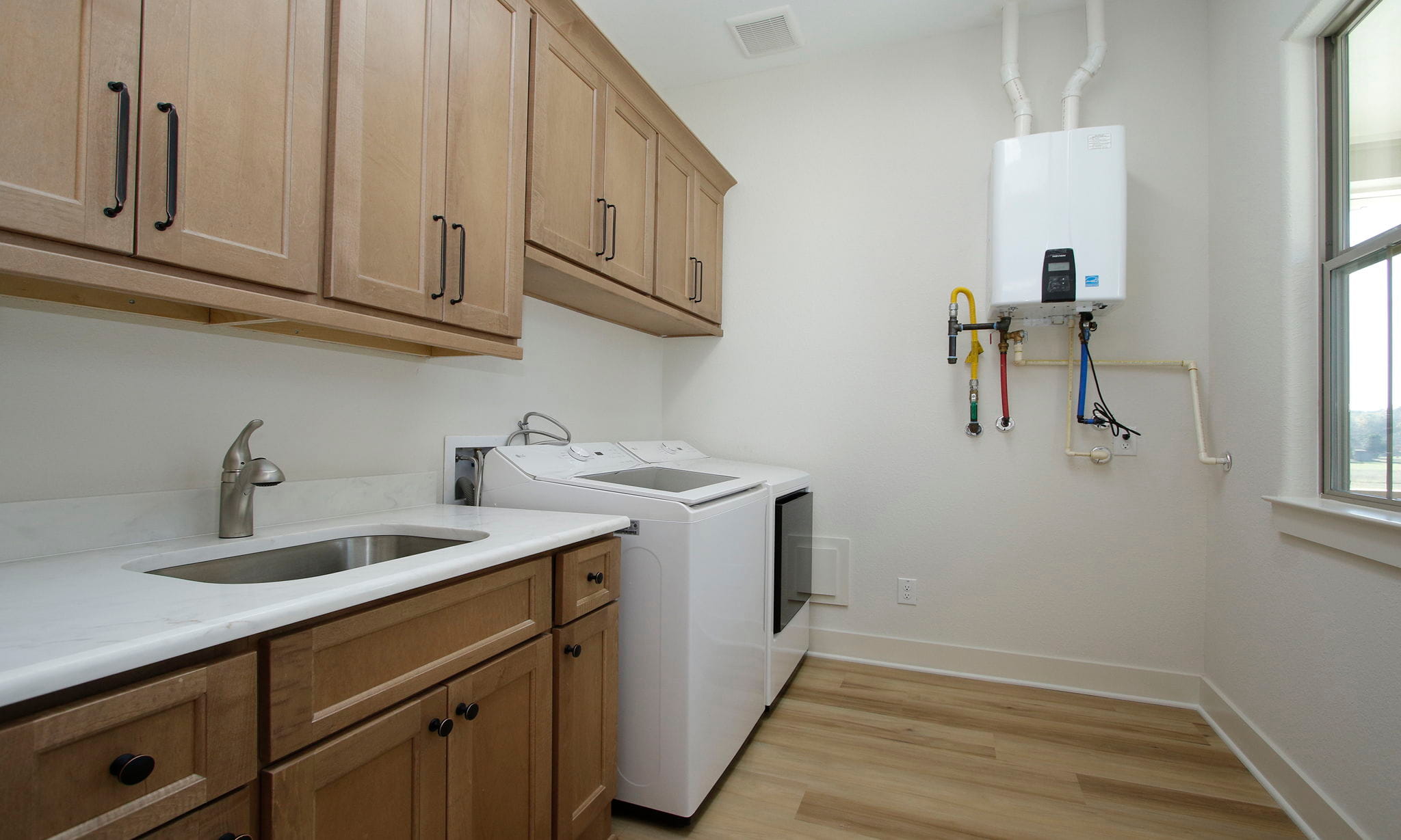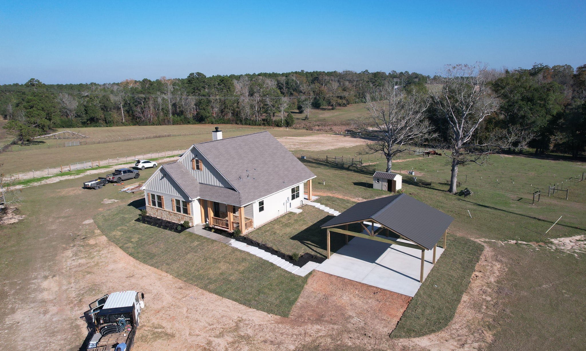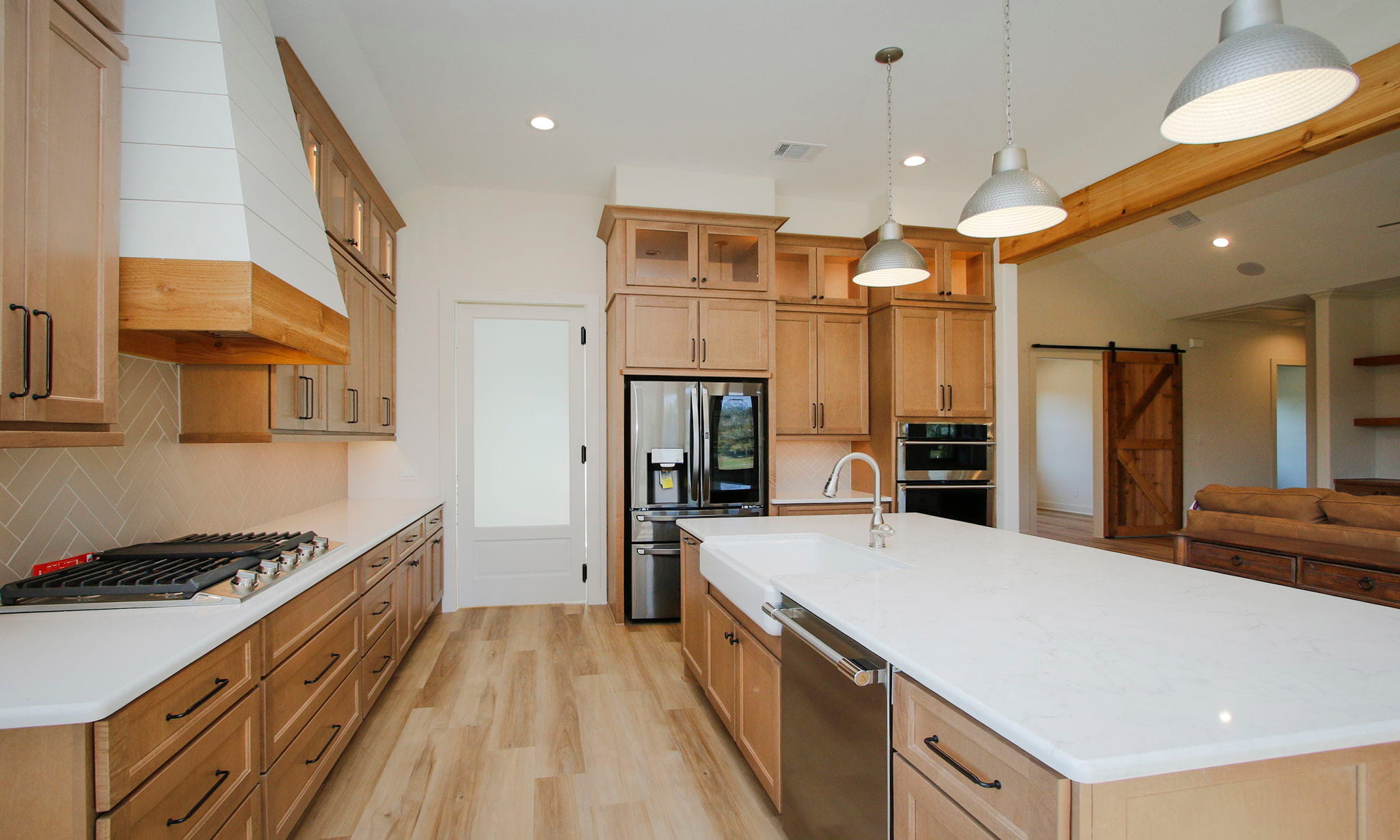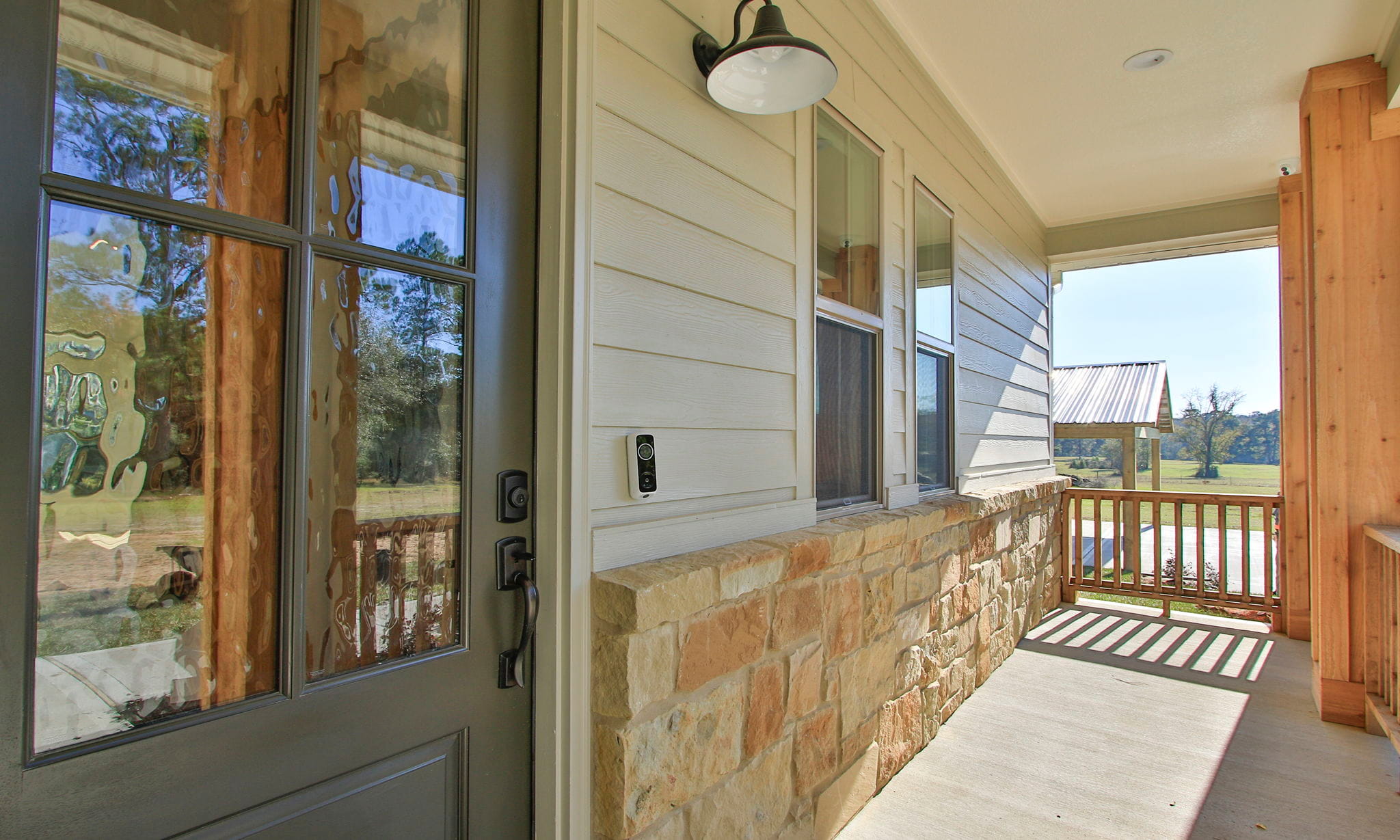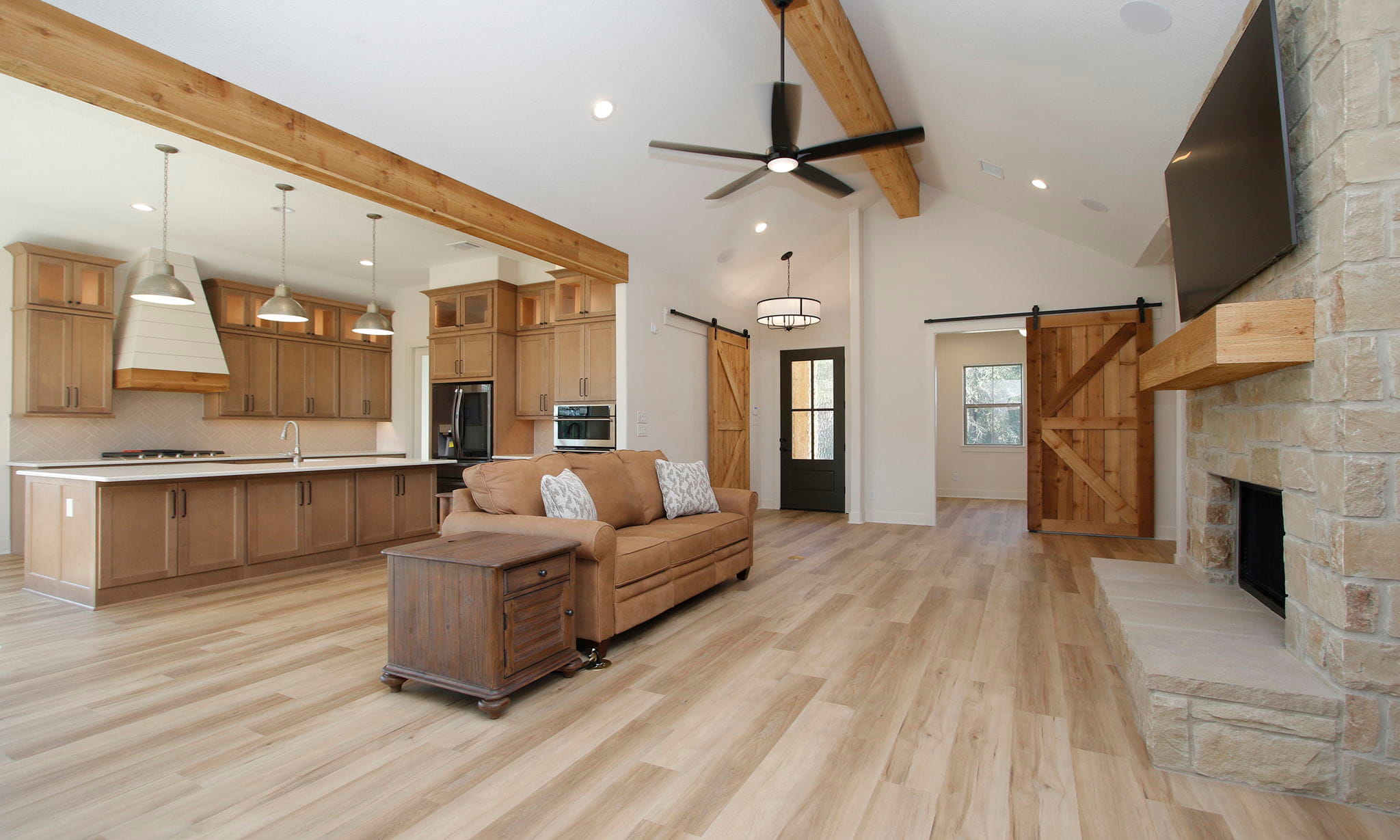 This charming two-bedroom, two-bath home blends efficiency with beautiful design, featuring a study, utility room, and walk-in working pantry. The open living area showcases a stone fireplace with cedar shelving, expansive kitchen cabinetry, and a bright dining space that opens to a screened-in cedar back porch.