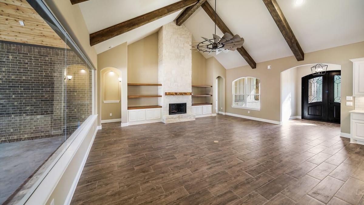 Hill country dream home with 3 bedrooms, media room and office, soaring beamed ceilings in family room and master bedroom.