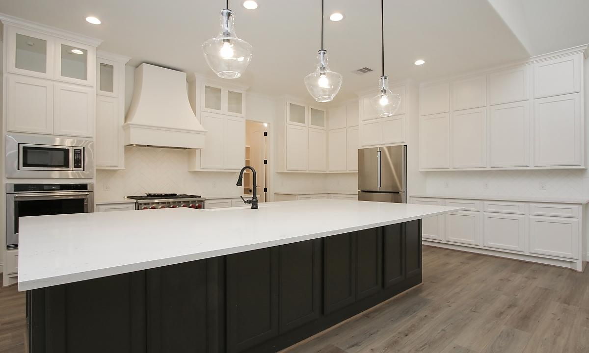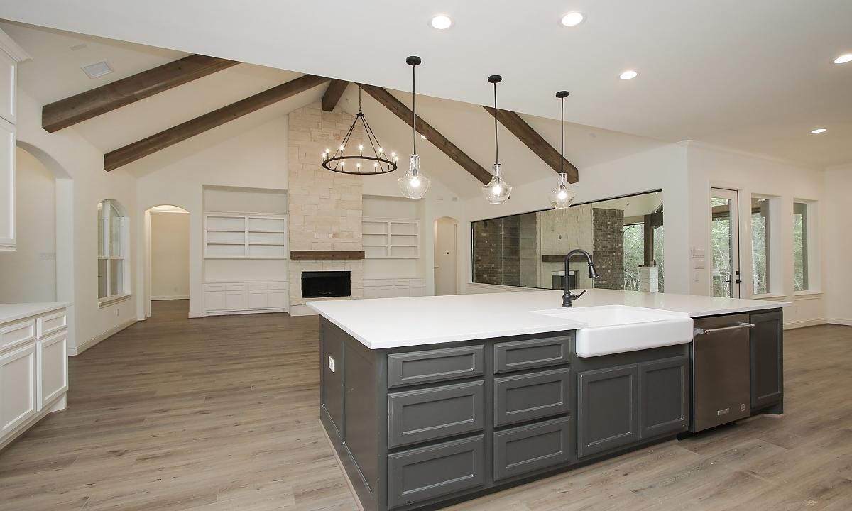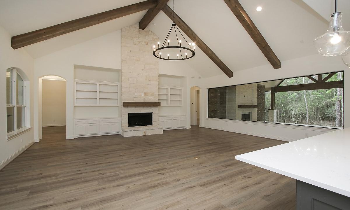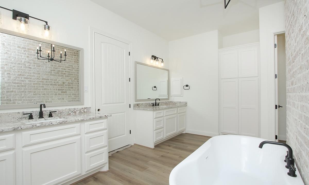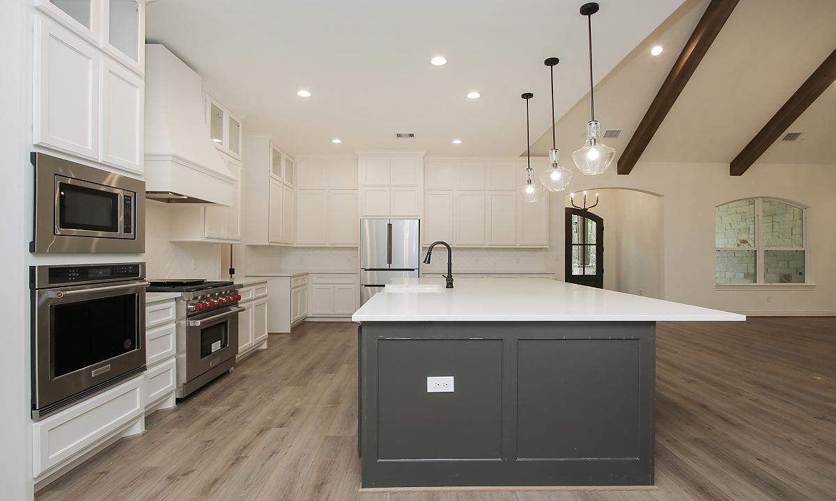 Elegant home features large kitchen with plenty of cabinents for storage, custom built-ins in the living room, and a freestanding tub in the master suite.