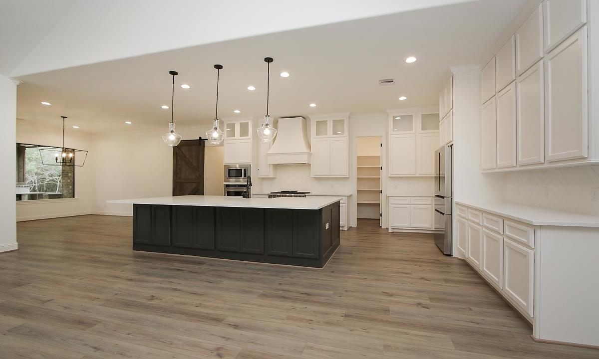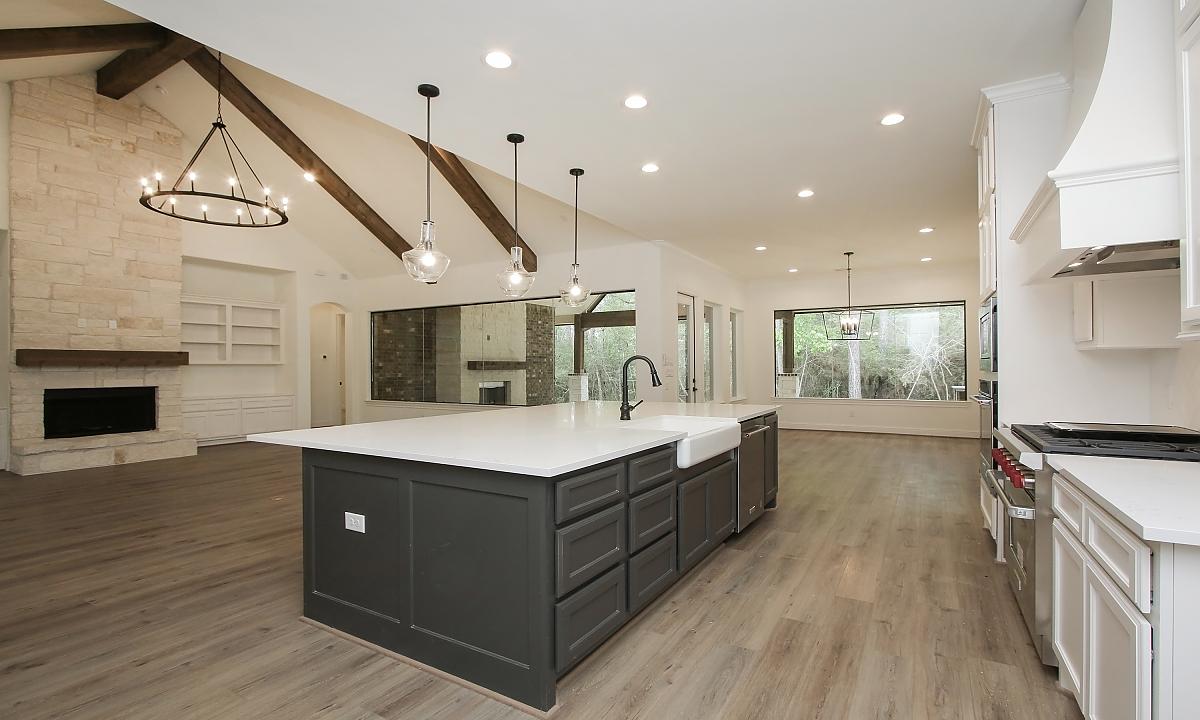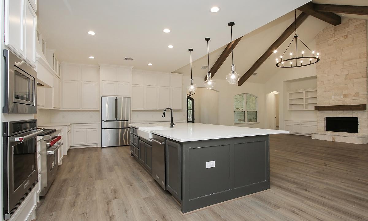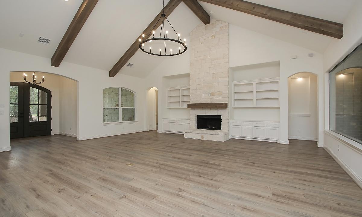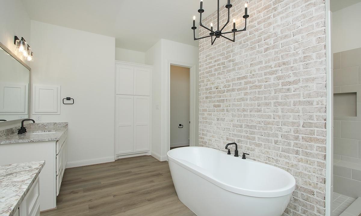 Elegant home features large kitchen with plenty of cabinents for storage, custom built-ins in the living room, and a freestanding tub in the master suite.