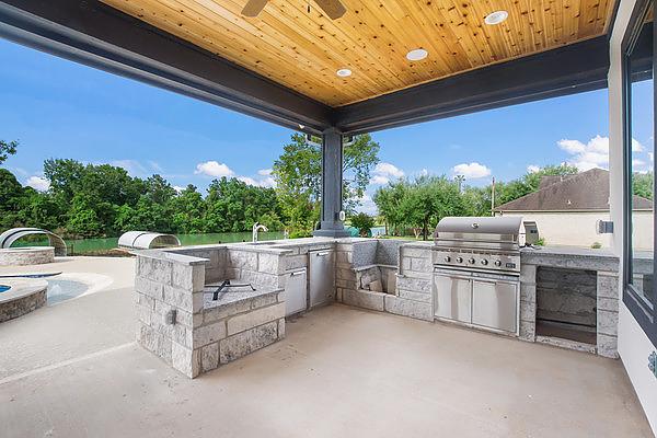 This home is the perfect space for gatherings with its spacious interior, swim-up pool bar, and summer kitchen.