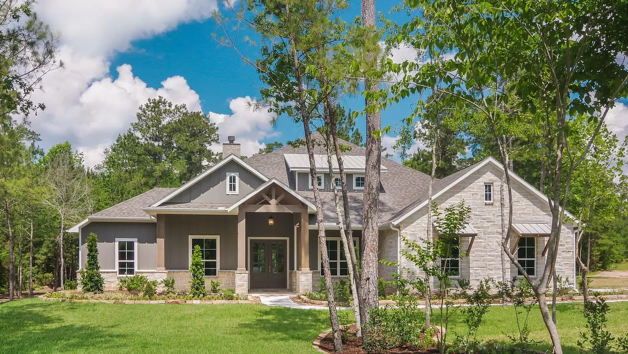 Media room inspired home highlighted by big windows that create a beautiful view from within.